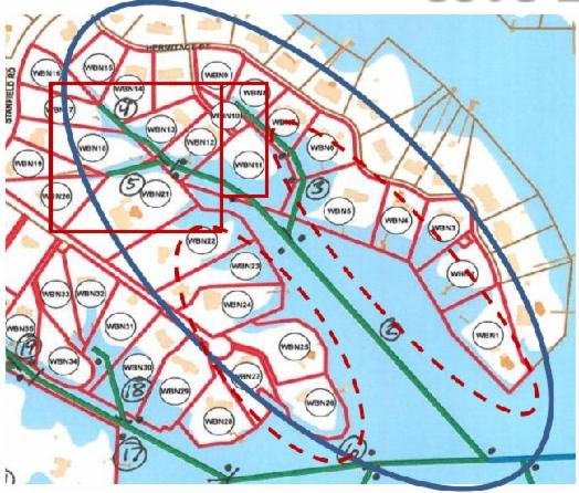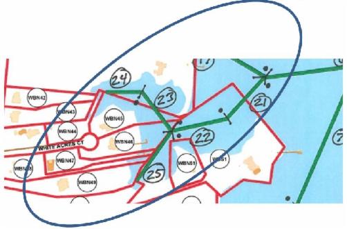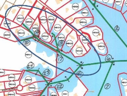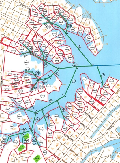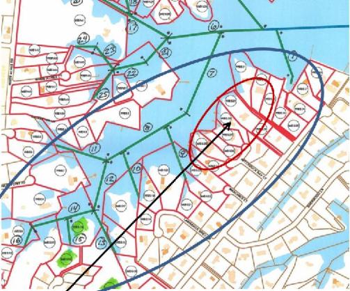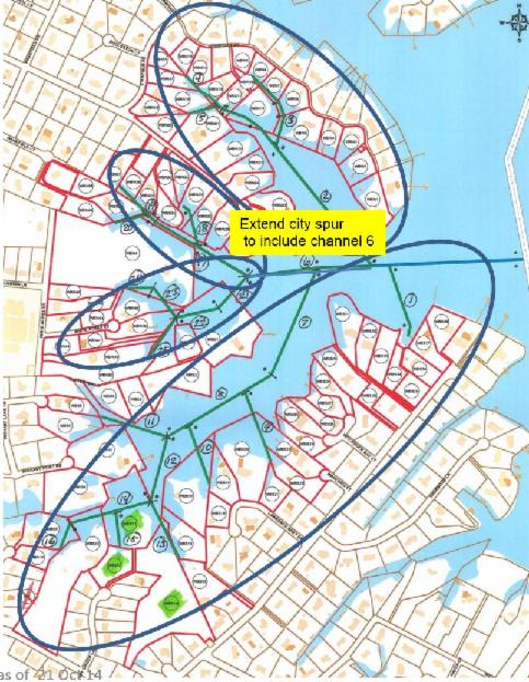 Inequitable Dredge Plan: Channels inequitably distributed—properties circled pay disproportionally higher costs but are farther from the city-subsidized channel. They pay more, but get less, while some pay a lot less and get a lot more. Why?